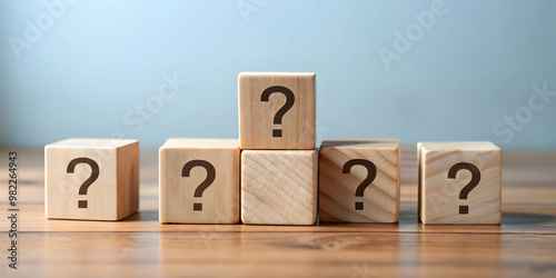 Wooden cubes with question marks engraved on four sides , uncertainty, confusion, decision making