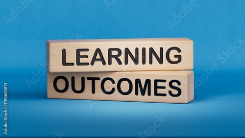 wooden cubes with text Learning outcomes and wooden cubes with letters. Wooden cube blocks. Copy space.3D rendering on blue background.