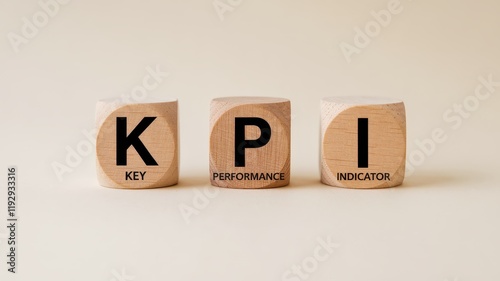 Wooden cubes with the letters KPI printed on them representing key performance indicators and business analytics tools used for tracking monitoring and improving organizational productivity
