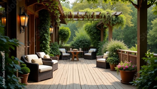 Wooden Deck with Wicker Furniture and Lush Greenery in a Garden Setting