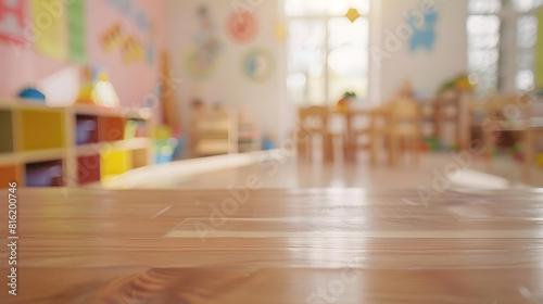 Wooden desk on blurred child room or kindergarten interior background : Generative AI
