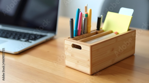 Wooden desk organizer holding pens, pencils and sticky notes with laptop in background