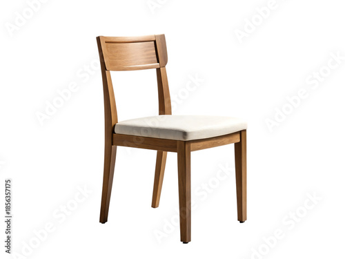 Wooden dining chair with white cushion isolated on transparent background