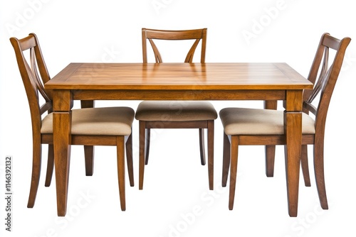 Wooden dining table set with four chairs and a cushioned seat.