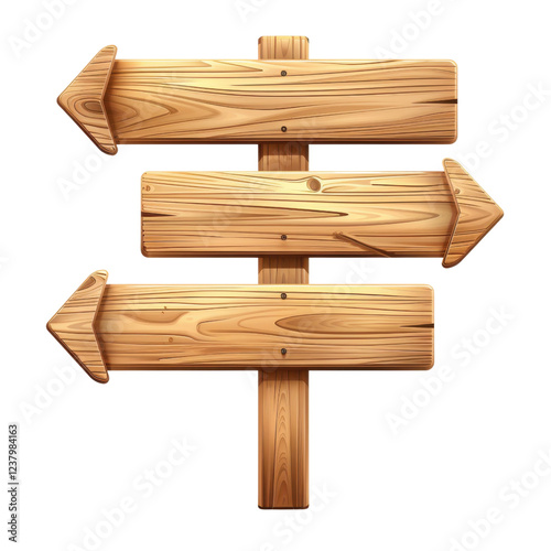 Wooden directional sign with three arrows pointing in different directions, showcasing rustic design. Ideal for guiding or indicating paths in nature or outdoor settings