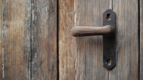 Wooden door handle on aged plank door