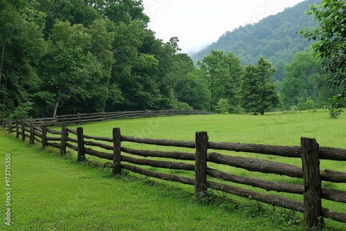 Wooden Fence Leading to a Green Meadow and Forested Hills