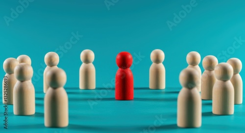 wooden figures, leadership concept, red figure standing out, group dynamics, teal background, minimalist composition, contrast, simplicity, business metaphor, individuality, team representation, stark