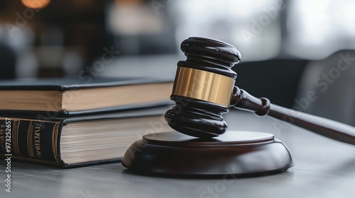 Wooden gavel and legal books on a desk in a courtroom setting, symbolizing justice and the law. Professional legal practice atmosphere.
