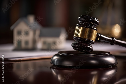 Wooden Gavel And Miniature House Model In Courtroom Setting
