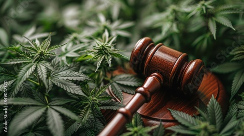 Wooden gavel lies among lush cannabis plants, signifying legal implications