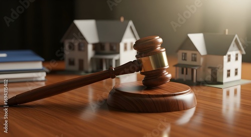 Wooden gavel resting on a desk in front of miniature house models and books, representing real estate law or foreclosure.