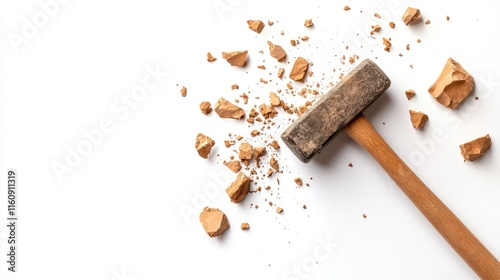 Wooden Hammer on White Background with Stone Chippings Splattered Around for Construction, Repair, Demolition, or Craft Projects