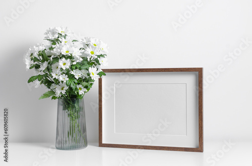Wooden horizontal artwork frame mockup with white flowers bouquet