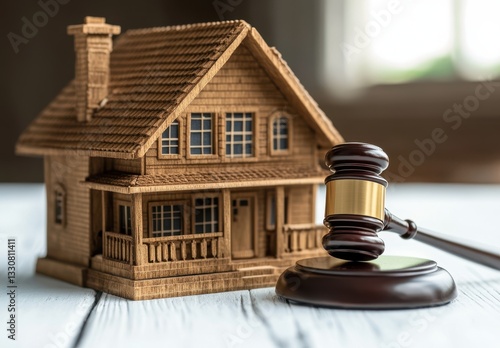 Wooden House Model and Gavel Symbolizing Real Estate Law and Property Legal Proceedings in a Bright Interior Setting
