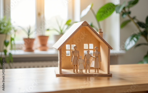 Wooden house model with wooden figures representing a family inside. Bright light from window and plants in background suggest a cozy home.