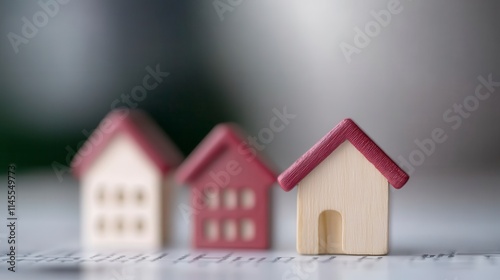 Wooden house models in red and white colors, arranged in a blurred background, symbolizing housing, real estate, or home ownership.