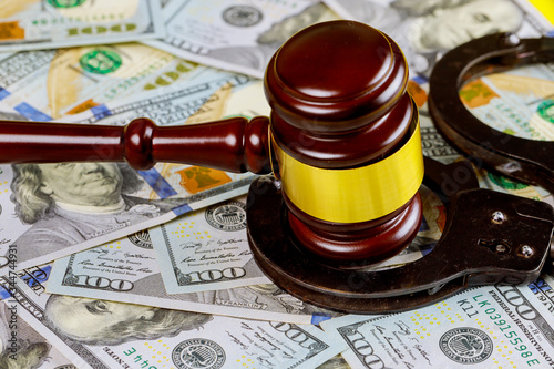 Wooden judge gavel with handcuffs on view from one hundred dollar bills in court