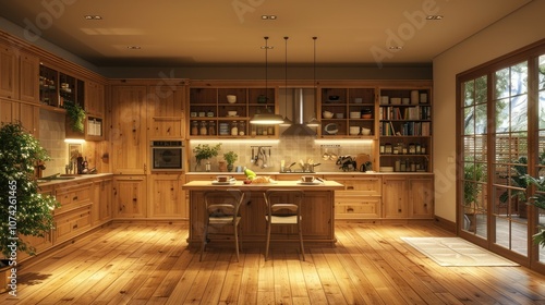 Wooden kitchen room with dining table and bar chairs, parquet floor. Kitchen open space room with bookshelf, wooden light furniture, 3D rendering no people