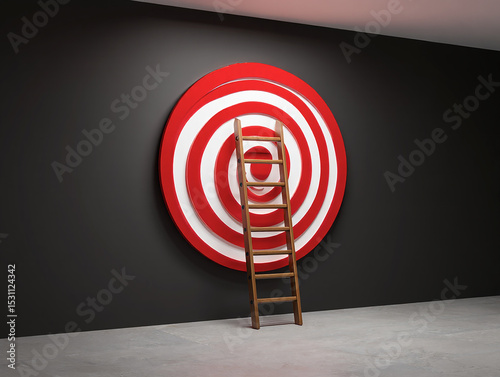 Wooden Ladder Leading to a Red and White Target on a Dark Wall