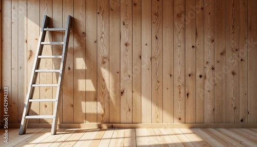 Wooden ladder leaning against a wall in minimal indoor space