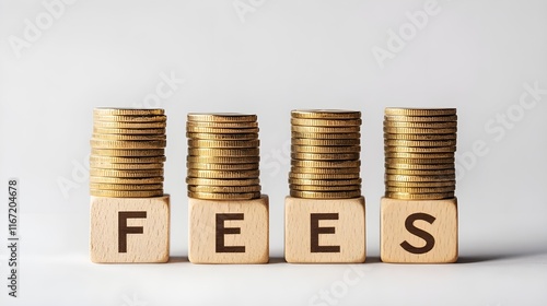 Wooden letter blocks spelling "FEES", stacks of gold coins, financial concept, neutral background, close-up photography, symmetrical composition, investment theme, monetary charges, banking imagery