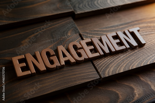 Wooden letters spelling "Engagement" on dark brown wood grain background, showcasing a concept of connection and commitment