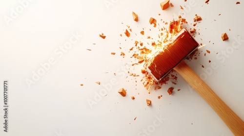Wooden mallet striking a surface with flying debris, white isolated background.
