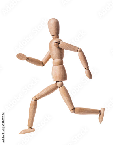 Wooden man isolated on a white background. Gestalt in the form of a running man. profile view