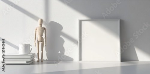 Wooden mannequin, books, mug, empty frame, sunlight. Mockup