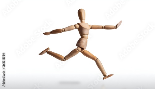 Wooden mannequin mid-jump, with a motion freeze effect, isolated on white background. Perfect for sports, fitness, and dynamic action themes.