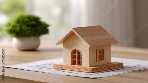 Wooden model house on table with green plant in background showcasing architectural design and home inspiration