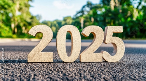 Wooden Numbers Representing the Year 2025 on a Scenic Road