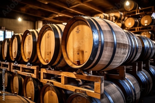 Wooden oak Port barrels in neat rows.