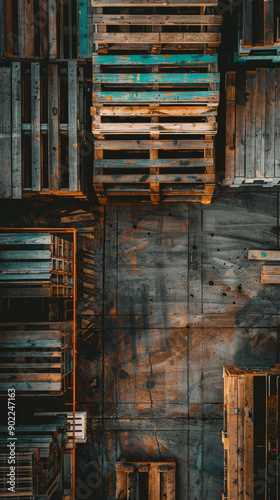 Wooden pallets on concrete floor, aerial view. Industrial logistics and transportation concept