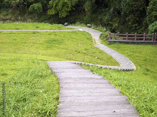 wooden path on grassland