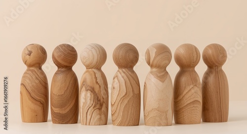 Wooden Peg Dolls. A Row of Natural Wood Figures on a Beige Background, Unity Concept.