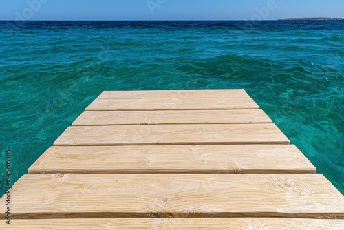 Wooden Pier Extending into a Calm Teal Sea Under Bright Sunlight