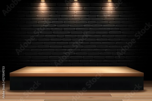 Wooden platform, brick wall, spotlights, dark room, product display