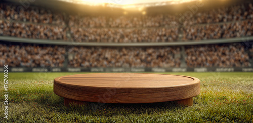 Wooden podium on a green football field in a stadium at sunset.