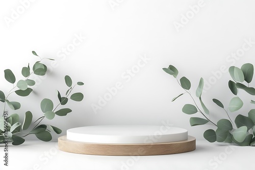 Wooden product podium with nature leaves and marble on white background. 3D rendering