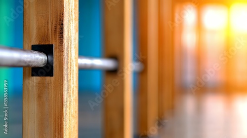Wooden Railing and Metal Bar with Abstract Background Blur for Design
