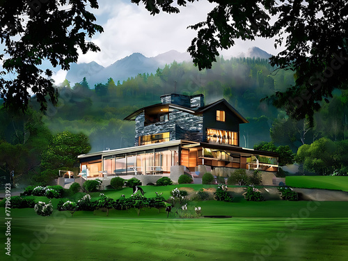 Wooden Retreat in the Mountains , A cozy wooden house sits on a hilltop, surrounded by majestic mountains.