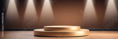 Wooden round podium for product presentation. Product showcase with sleek, wood, circular block
