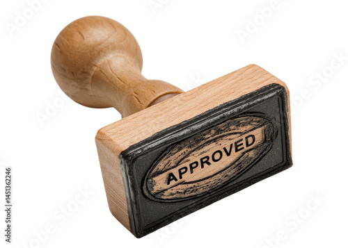 Wooden rubber stamp with the word APPROVED isolated on transparent background, concept approval, quality, success
