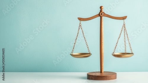 Wooden scale of justice on a light blue background symbolizing fairness and legal balance in society