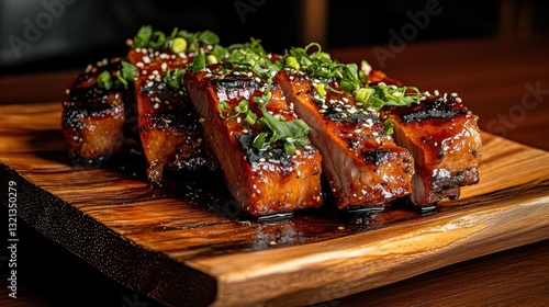 Wooden serving board with six pieces of grilled meat on it. the meat appears to be a type of pork belly, with a dark brown color and a glaze on top.