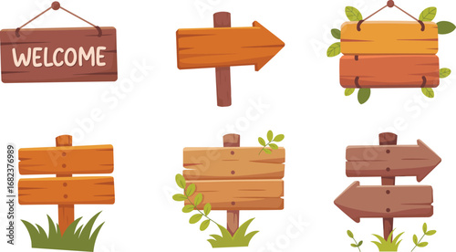 Wooden sign illustrations with various designs, arrows, welcome message, nature-inspired, rustic, directional signs, perfect for outdoor décor