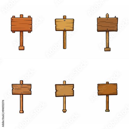 Wooden signboard set. Medieval vintage wood sign board on pole Road direction signpost collection. Rustic pointer Old blank information placard Wooden empty billboard, signboard panel. Cartoon vector.