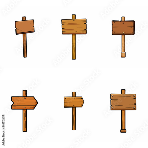 Wooden signboard set. Medieval vintage wood sign board on pole Road direction signpost collection. Rustic pointer Old blank information placard Wooden empty billboard, signboard panel. Cartoon vector.
